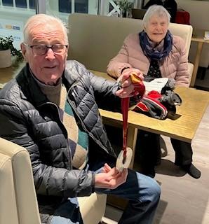 Liisa ja Yrjö Hutri ihailevat Wille Mäkelän curling-hopeamitalia Torinon olympialaisista.