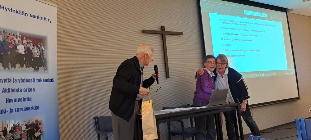 Vasemmalta kokouksen puheenjohtaja Pertti Rantala, kokouksen sihteeri Helena Jarva ja tuleva puheenjohtaja Anne Vuorinen