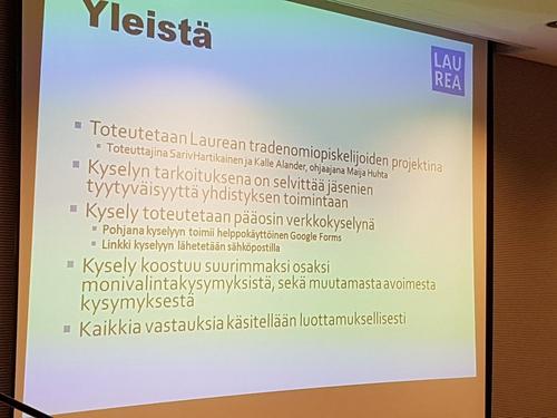 Laurean opiskelijat Sari Hartikainen ja Kalle Alander esitteli meille tekemänsä jäsenkyselymme. Kysely on lähetetty uuden Kilta ohjelmalla kaikille joilla on sähköposti ja osalle lähetimme kirjeessä. Jäsenkysely oli myös kotisivuilla.