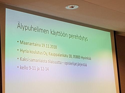Digi- koulutus, Hyrian opettaja Elisa Utriainen ja oppilaat: Älypuhelimen käyttöön perehdytys alkaa maanantaina 19.11 Hyrian koututus OY, Hyvinkää. Oppilaat järjestävät kaksi samanlaista tilaisuutta.Jatkoa seuraa varmasti.