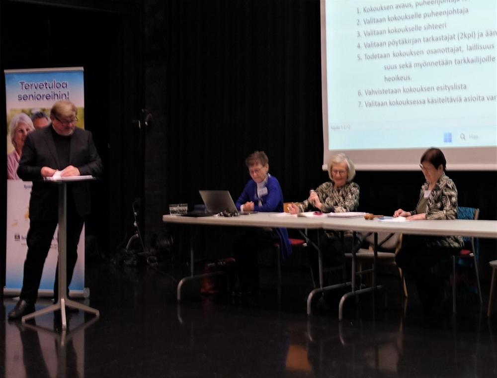 Puheenjohtaja Timo Harju kertoi mitä kuuluu Hyvinkään senioreille tänään. Sokerina pohjalla kuultiin ja nähtiin Hyvinkään senioreiden omien jäsenten Sinikka Lehdon ja Elvi Tommolan ”Runoja ja musiikkia” -esitys. Sinikka ja Elvi olivat koonneet hersyvän kokonaisuuden kevätrunoista ja kepeästä musiikista. Esitys kirvoitti raikuvat aplodit ja bravo -huudot yleisöltä.