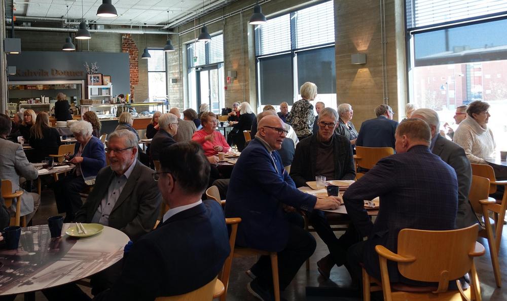 Uudenmaan kansallisten senioreiden piirikokousväki kokoontui 30.3.2023 Hyvinkään keskustassa sijaitsevan vanhan Villatehtaan Studio Donnerissa. Villatehtaan tiloissa toimii nykyisin Hyvinkään kaupungintalon lisäksi monipuolisia kulttuuri- ja taidetiloja.