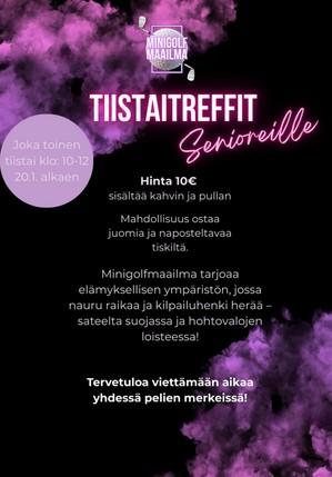Tule ja osallistu senioreille tarkoitettuun "tiistaitreffit" tapahtumaan, Uudenmaankatu 4-6 Minigolfmaailmassa klo 10 - 12.00 joka toinen tiistai 20.1.alkaen. 10 € sisältää kahvit ja pullan.