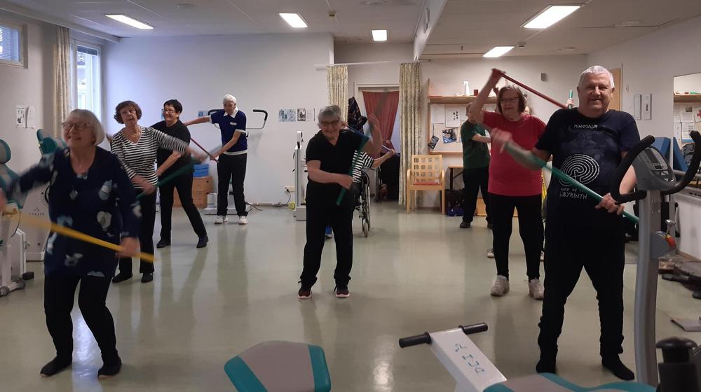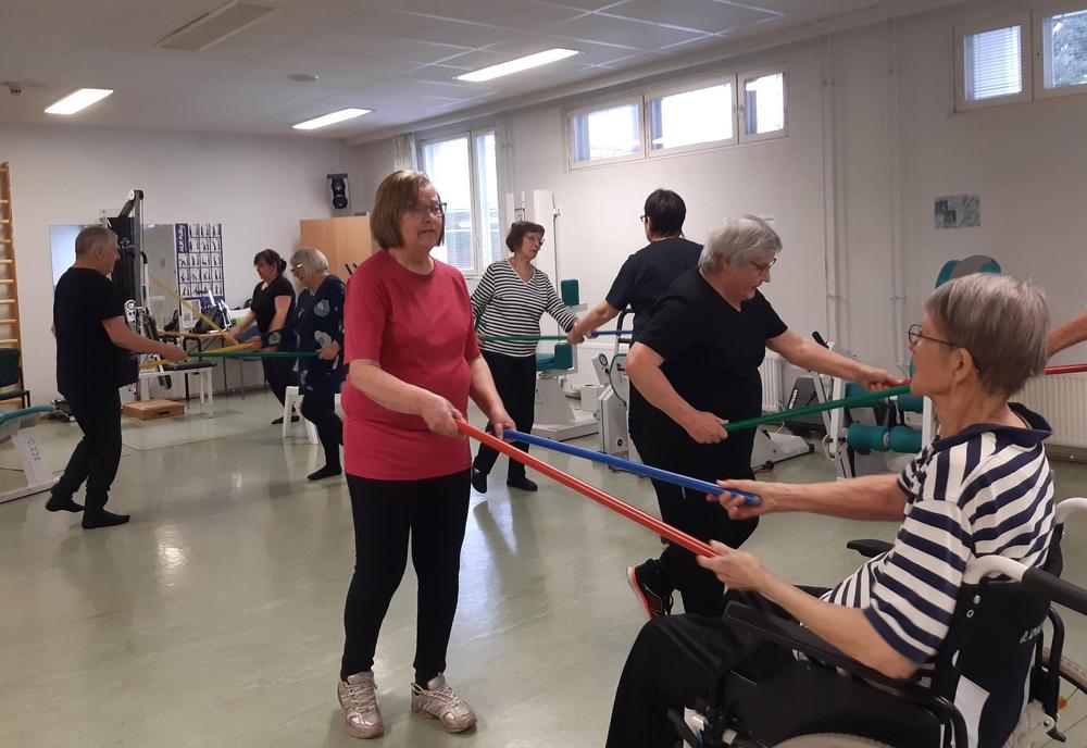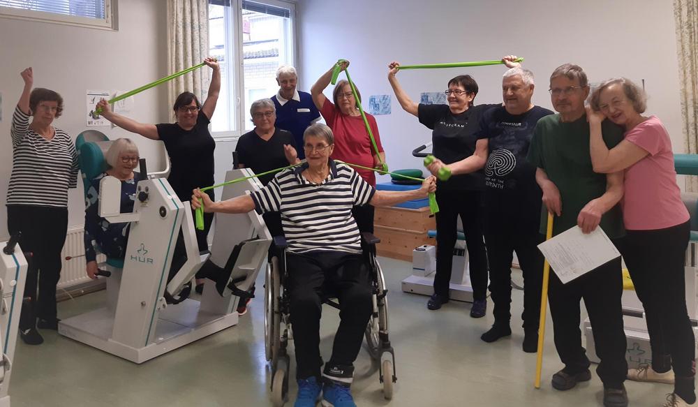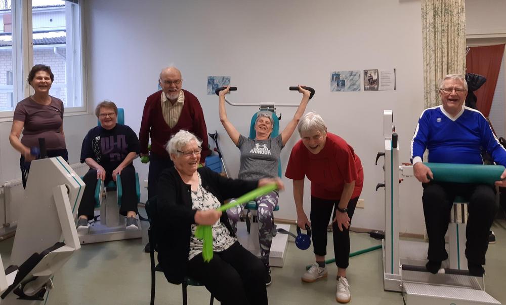 Kuntoiluintoiset seniorimme kokoontuvat viikottain tunnin ajaksi vetreyttämään kroppaansa Lepovillan kuntosalille.